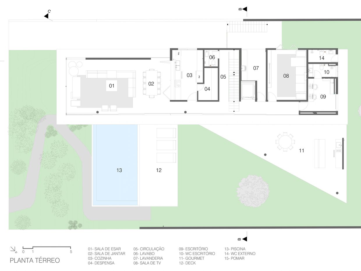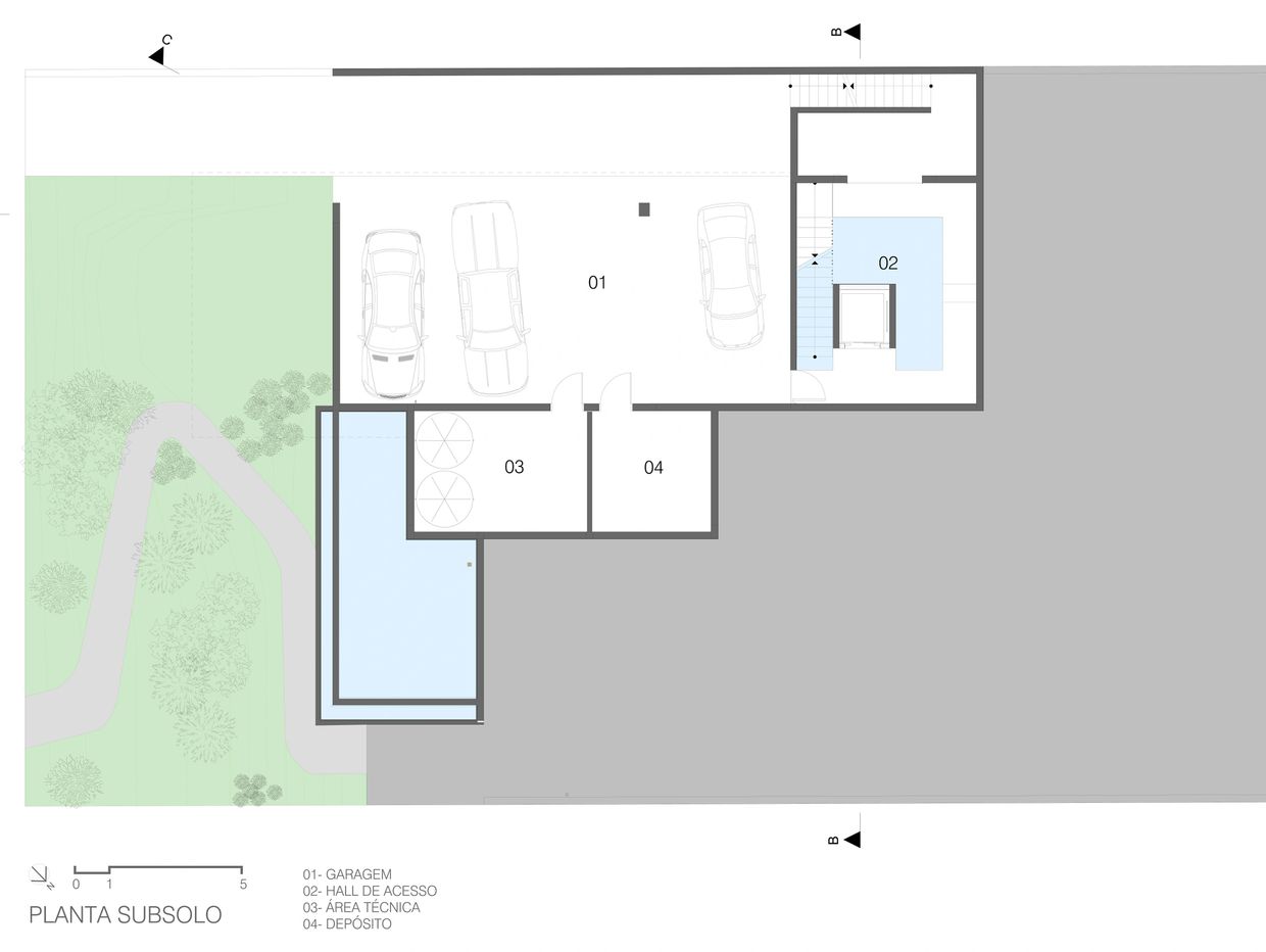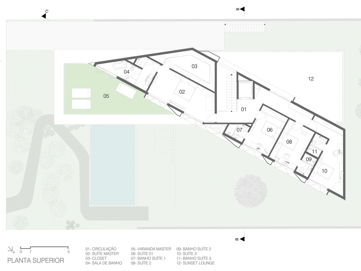 Organizada em 3 pavimentos, o subsolo abriga a garagem, hall de acesso e área técnica, no térreo estão o living, sala de jantar, cozinha, sala tv, escritório, área gourmet e área de lazer. No pavimento superior estão as 4 suítes e uma grande varanda de uso comum com vista para o pôr do sol.