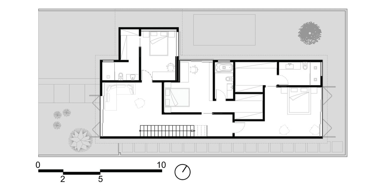 Entre todas as diretrizes do programa, o principal desejo da família era de ter uma casa aberta e com espaços integrados favorecendo o convívio do dia-a-dia, para isso utilizamos uma implantação longitudinal, gerando um grande espaço livre na face norte do terreno, favorecendo a insolação, para a área de lazer.
